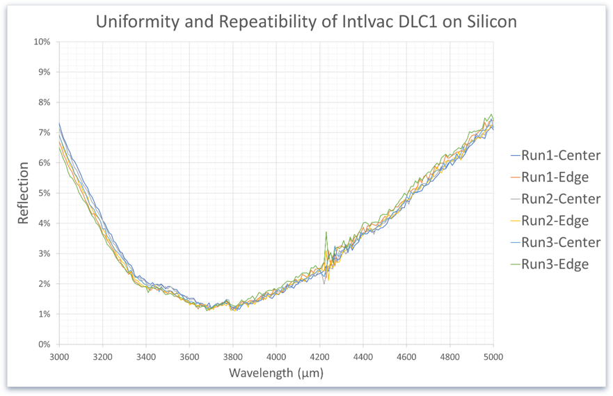Intlvac bietet eine umfassende Auswahl an Dünnschichtabscheidungssystemen und -dienstleistungen, die speziell auf das Infrarotspektrum abgestimmt sind – einschließlich Verdampfung, Sputtern und plasmaunterstützter chemischer Gasphasenabscheidung (PECVD). Wir liefern Breitband-Antireflexbeschichtungen im Bereich von 3–5 μm und 8–12 μm, geeignet für Silizium-, Germanium- und Chalkogenidoptiken. Diamantbeschichtungen dienen als ideale Schutzschicht für diese weichen Materialien und sind dank ihres hohen Brechungsindex auch perfekt als einzelne Dünnschicht für Antireflexanwendungen geeignet.