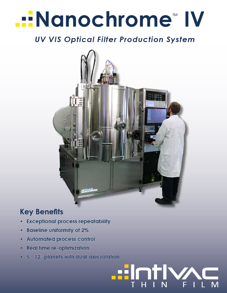 Intlvac Nanochrome™ IV UV VIS 离子辅助沉积系统 是精密光学镀膜技术领域的最新创新成果。该系统专为卓越性能而设计,能够通过 电子束蒸发 结合 离子辅助 并在 光学监控 下运行,实现复杂光学滤光片的高精度制备。